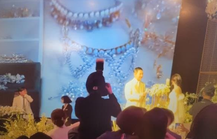결혼식이 끝난 뒤 온라인 커뮤니티와 각종 SNS에는 결혼식 내부 모습이 담긴 사진과 영상이 공개됐다. 그중 한 영상에는 신랑신부인 이승기와 이다인 뒤로 주얼리 브랜드 광고 영상이 송출되는 모습이 담겼다.