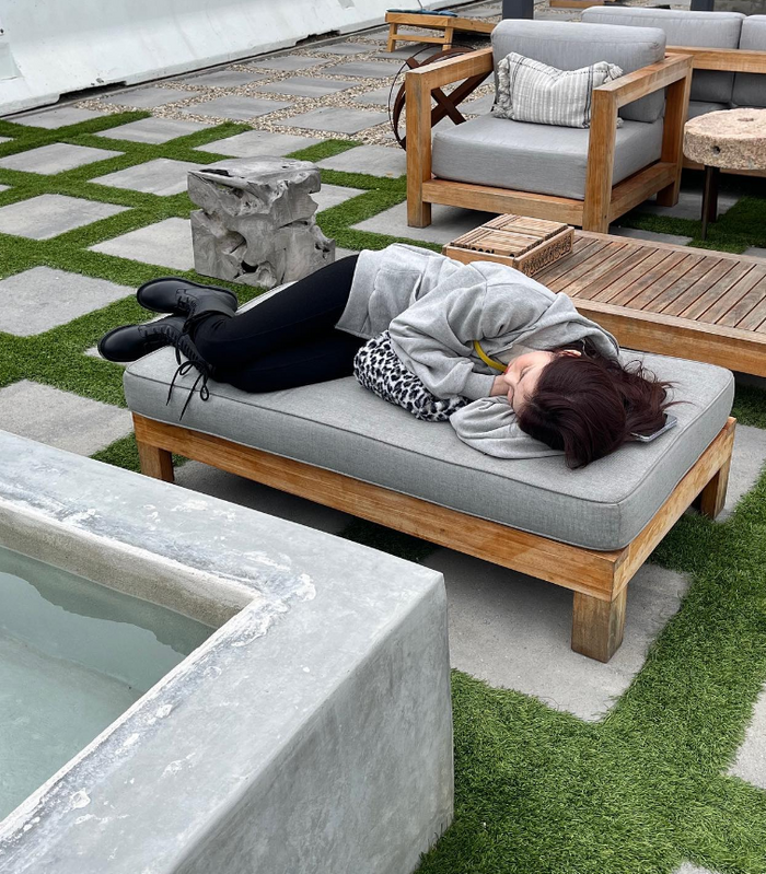이어진 사진에는 회색 가디건을 걸친 채 긴 소파에 누워 잠시 낮잠을 즐기는 한소희의 모습도 포착돼 웃음을 안겼다.