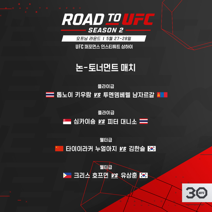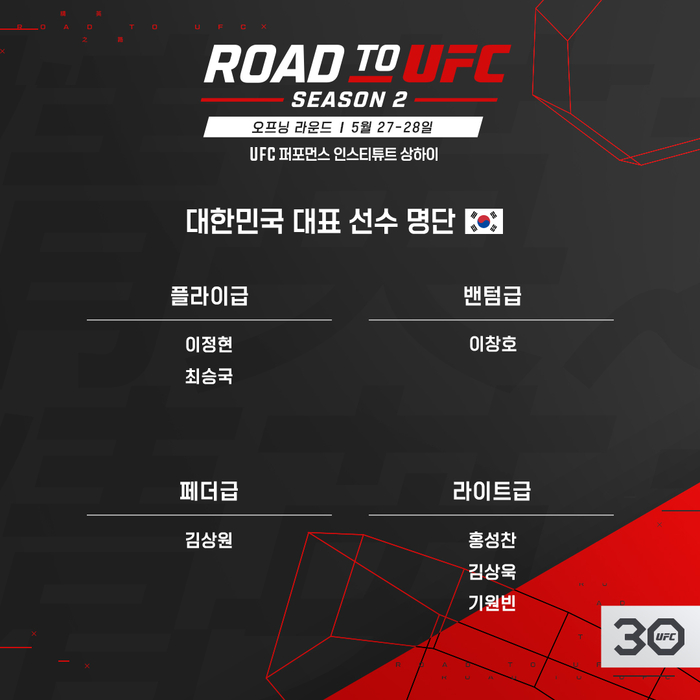한편, 로드 투 UFC는 아시아 지역 정상급 MMA 유망주들에게 UFC와 계약할 수 있는 기회를 제공한다. 지난해 6월부터 지난 2월까지 시즌 1이 진행됐다. 그 결과 플라이급 박현성(27)과 페더급 이정영(27)이 우승을 차지해 UFC와 계약했다.