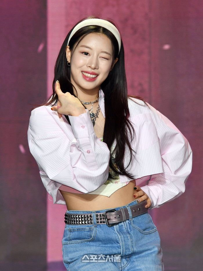 그룹 피프티 피프티 (FIFTY FIFTY)의 시오가 13일 서울 강남구 일지아트홀에서 진행된 기자간담회에서 열정적인 무대를 선보이고 있다.