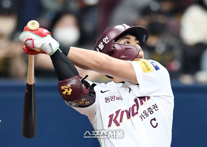 키움 히어로즈 이정후가 16일 고척스카이돔에서 열린 2023 KBO리그 KIA 타이거즈와 경기 연장 10회말 1사 1루 상황에서 KIA 투수 김대유를 상대로 끝내기 홈런을 친 뒤 타구를 바라보고 있다. 이정후의 시즌 2호 홈런. 2023. 4. 16.
