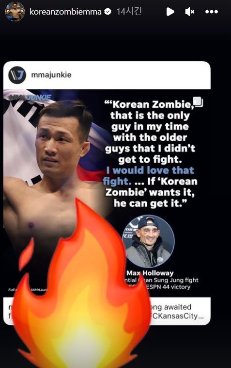 그러던 중 마침 할로웨이가 대결해 보고 싶다는 의사를 밝혔으니 정찬성에게는 더할 나위 없는 좋은 기회다. 그는 이런 심정을 자신의 SNS 스토리에 불꽃 이모티콘과 함께 담았다.