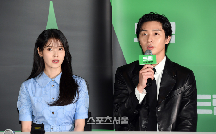 배우 아이유(왼쪽)와 박서준이 17일 서울 강남구 메가박스 코엑스에서 진행된 영화 ‘드림’ 언론 시사회 및 기자간담회에서 취재진의 질문에 답을 하고 있다.