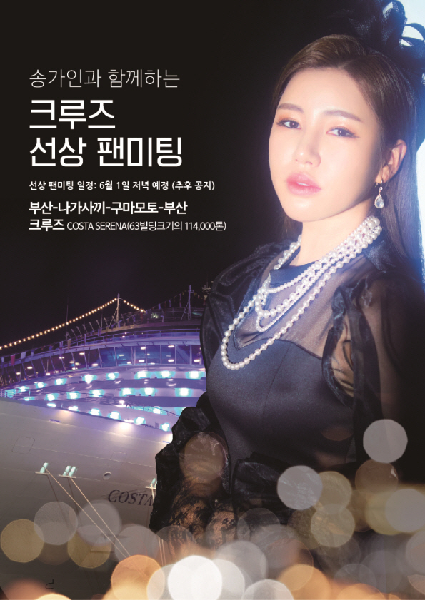 송가인은 오는 6월 1일부터 4일까지 3박 4일 일정으로 진행되는 ‘송가인과 함께하는 크루즈 선상 팬미팅’을 개최한다.