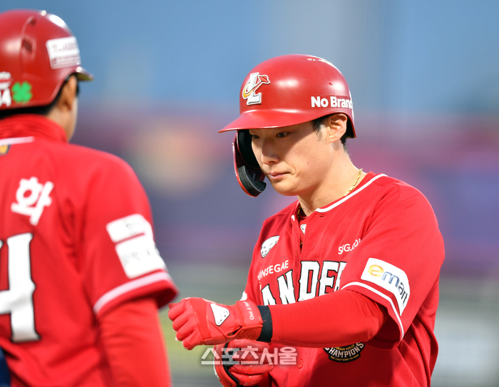 SSG 2번타자 최지훈가 18일 수원KT위즈파크에서 열린 2023 프로야구 KT위즈와 SSG랜더스의 시즌 첫 경기 3회초 1사 1루에서 안타로 출루하고 있다. 2023.04.18.