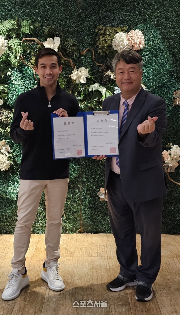 [스포츠서울 | 필리핀 주재기자 방영수] 한류문화관광총연합회 장한식 회장은 지난 14일 필리핀 GMA7TV 방송국 톱스타 ‘켄 찬’을 한류문화관광총연합회 홍보대사로 임명하고 임명장을 수여했다.