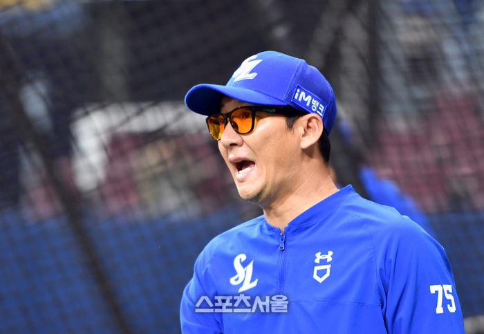 삼성 손주인 수비코치가 19일 고척스카이돔에서 열린 2023 프로야구 키움히어로즈와 삼성라이온즈의 경기에 앞서 선수들의 수비훈련을 돕고 있다. 2023.04.19.