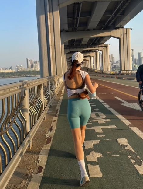 류화영은 아슬아슬하게 등이 파인 티셔츠에 레깅스 반바지를 입고 한강 다리에서 산책하고 있다.