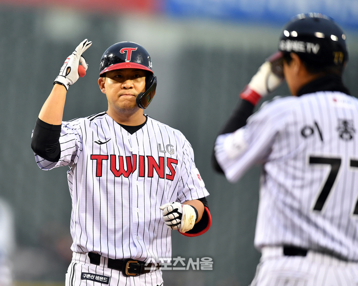 LG 3번타자 김민성이 20일 잠실야구장에서 열린 2023 프로야구 LG트윈스와 NC다이노스의 경기에서 1회말 무사 1,2루에서 1타점 안타로 출루하고 있다.2023.04.20.