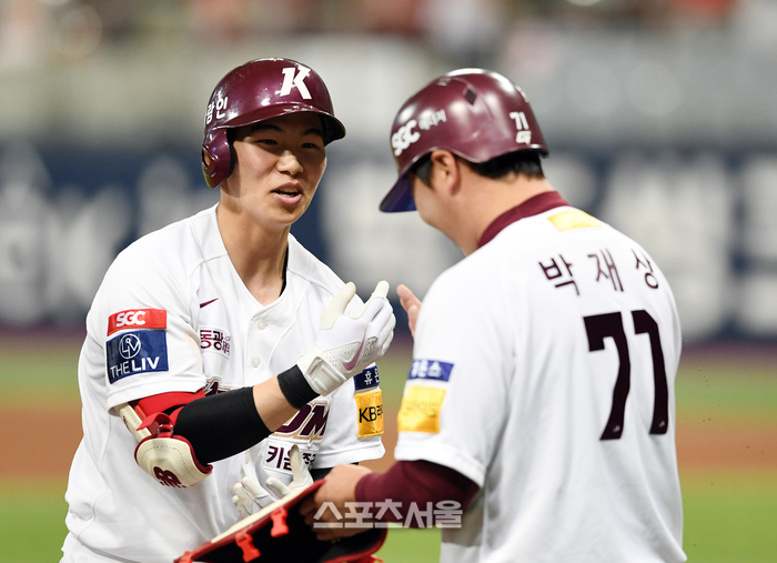 키움 히어로즈 김혜성이 20일 고척스카이돔에서 열린 2023 KBO리그 삼성 라이온즈와 경기 1회말 무사 삼성 선발 뷰캐넌을 상대로 3루타를 친 뒤 박재상 코치와 이야기를 나누고 있다. 2023. 4. 20.
