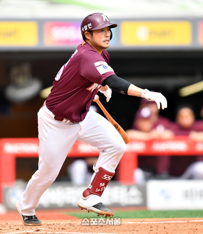 키움 8번타자 이지영이 23일 인천SSG랜더스필드에서 열린 2023 프로야구 SSG랜더스와 키움히어로즈의 경기 4회초 1사 만루 1루수앞 내야땅볼을 치고 1루로 향하고 있다. 3루주자 러셀은 홈에서 세이프되며 2-3으로 추격하는 키움. 2023.04.23.