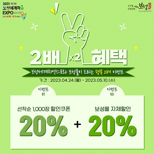 또한 보성세계차엑스포 마지막 날인 5월 7일에는 네이버 라이브커머스를 통해 제품을 구매하는 선착순 2천 명에게‘보성몰 전 품목 5천 원 할인 쿠폰’을 추가 지급한다.