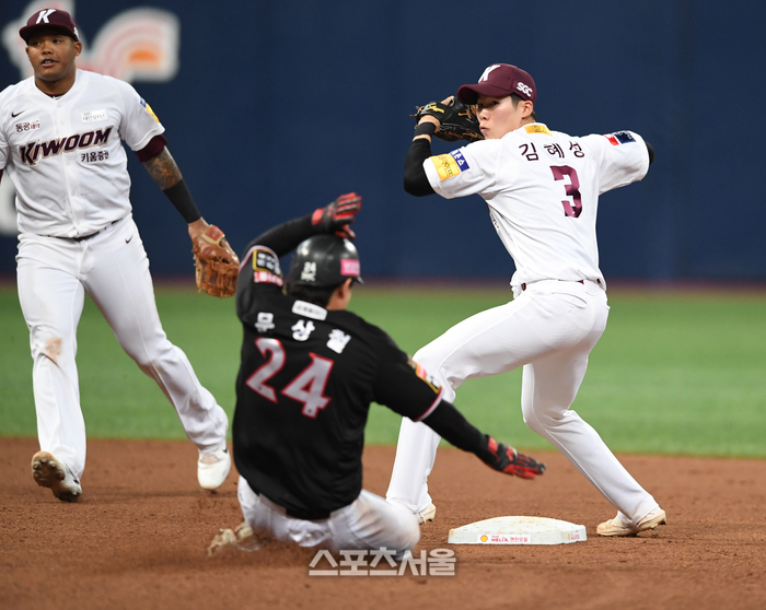 키움 히어로즈 2루수 김혜성(오른쪽)이 25일 고척스카이돔에서 열린 2023 KBO리그 KT 위즈와 경기 5회초 1사 1루 KT 이상호의 병살타 때 1루 주자 문상철을 포스 아웃한 뒤 1루로 송구하고 있다. 2023. 4. 25.