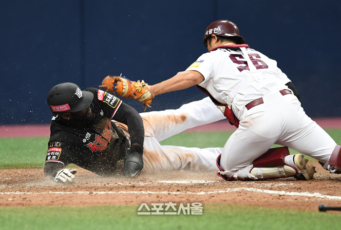 키움 히어로즈 포수 이지영이 25일 고척스카이돔에서 열린 2023 KBO리그 KT 위즈와 경기 7회초 1사 1-3루 상황에서 KT 문상철의 번트 때 홈으로 파고들던 KT 3루 주자 알포드를 태그하고 있다. 2023. 4. 25.