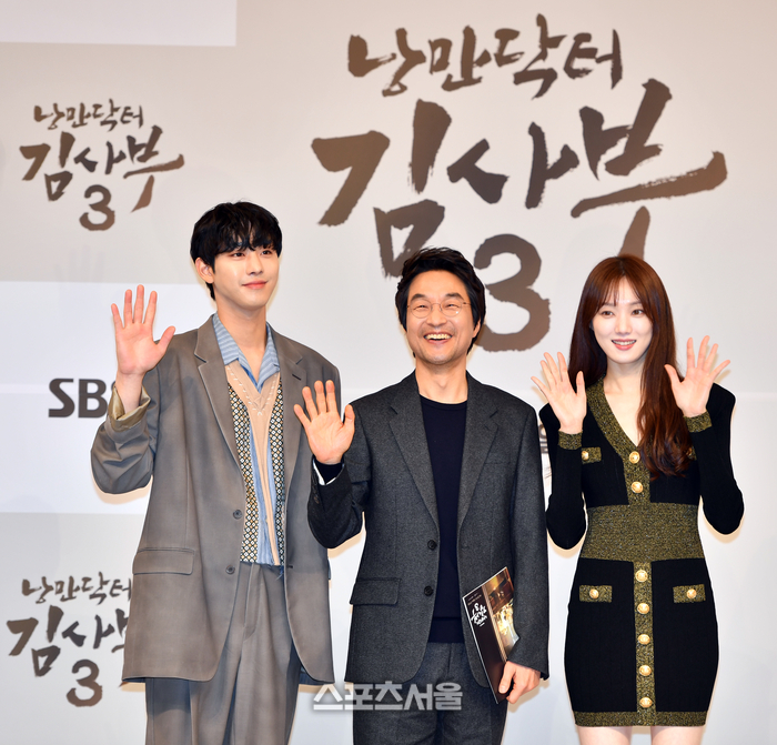 한석규와 안효섭, 이성경이 26일 목동SBS에서 열린 16부작드라마 ‘낭만닥터 김사부3’ 제작발표회 무대에 올라 포토타임을 갖고 있다.