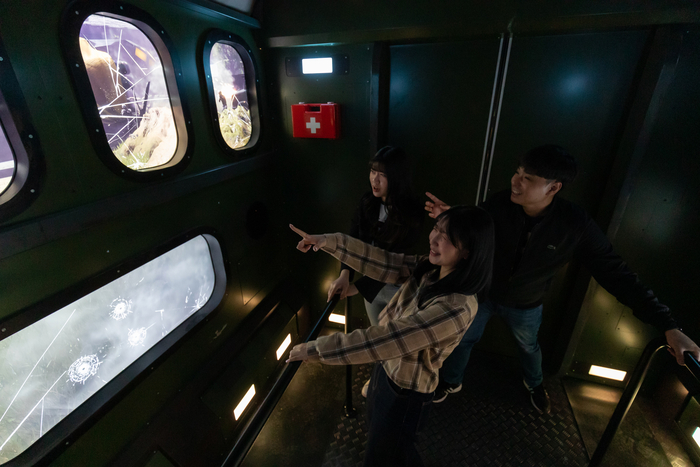 먼저 실제 ‘배틀그라운드’ 게임에서와 같이 수송기에 탑승하면 실제와 같은 외부 충격과 흔들림이 고스란히 느껴진다. 또한 사실적인 수송기 세트 구성과 실감나는 미디어 연출이 더해져 실제 불시착을 한 듯 자신도 모르게 ‘배틀그라운드’의 세계관으로 빠져든다.