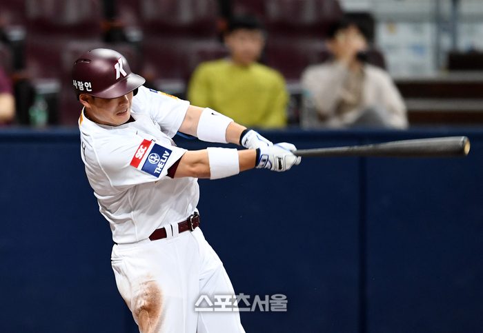키움 이원석이 27일 고척스카이돔에서 열린 2023 KBO리그 KT 위즈와 경기 2회말 무사 KT 선발 조이현을 상대로 안타를 치고 있다. 삼성에서 키움으로 트레이드 된 이원석의 첫 안타. 2023. 4. 27.