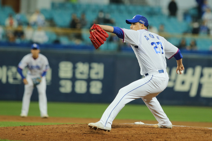 그런데 마운드에 오른 투수가 김태훈이었다. 이날 트레이드를 통해 영입한 선수. 서울에서 급하게 대구로 내려와 새 유니폼을 받았다. 바로 등판이 만만치 않아 보였다.