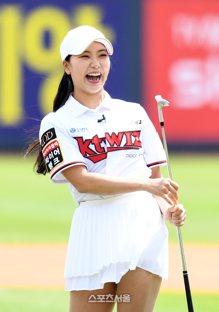 미스코리아 출신 프로골퍼 김솔비가 30일 수원 KT위즈파크에서 열린 2023 KBO리그 KT 위즈와 삼성 라이온즈의 경기에 앞서 골프 샷으로 시구를 하고 환하게 웃고 있다. 2023. 4. 30.