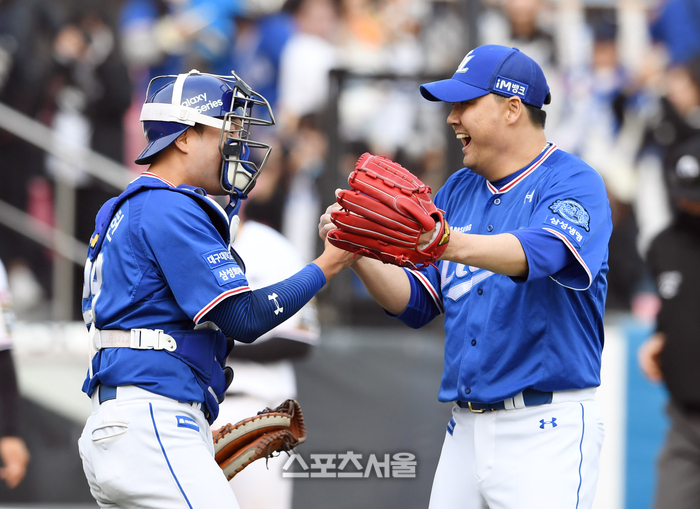 삼성 라이온즈 김태훈이 30일 수원 KT위즈파크에서 열린 2023 KBO리그 KT 위즈와 경기 연장 10회말 2사 1-2루 상황에서 KT 오윤석을 3루 땅볼로 잡아내며 승리를 지켜낸 뒤 포수 이병헌과 하이파이브를 하며 기뻐하고 있다. 김태훈은 1이닝을 무실점으로 막아내며 시즌 2세이브를 기록했다. 2023. 4. 30.