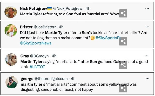 그러면서 ‘토트넘 지지자는 재빨리 트위터 등을 통해 테일러의 발언을 비판하고 있다’고 했다. 다수 팬은 ‘테일러가 손흥민에게 사과해야 한다’, ‘쿵후라는 발언은 역겹고 혐오적이고 인종차별적’이라고 목소리를 냈다.