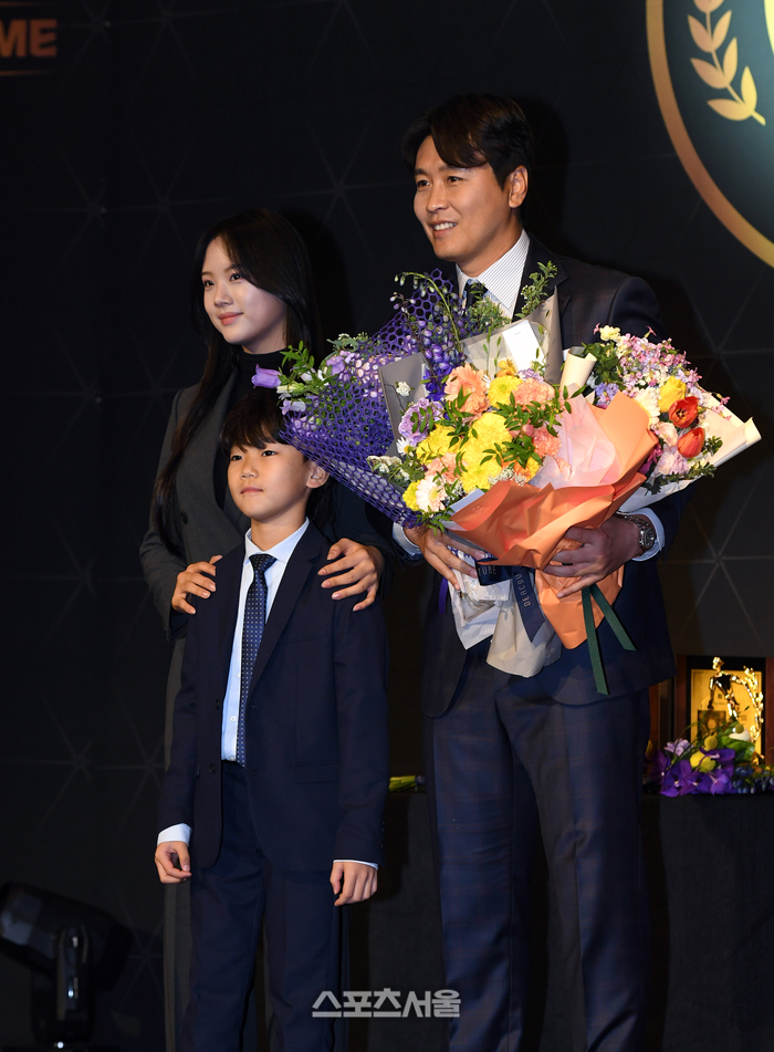 이동국(오른쪽)이 2일 서울 중구 앰버서더서울풀만호텔에서 진행된 K리그 명예의전당 헌액식에서 헌액자로 선정된 뒤 가족과 함께 기념촬영을 하고 있다. 2023. 5. 2.