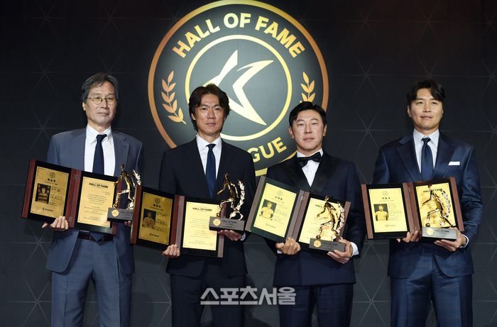 2일 서울 중구 앰버서더서울풀만호텔에서 진행된 K리그 명예의전당 헌액식에서 영광의 헌액자들이 기념촬영을 하고 있다. 왼쪽부터 최순호 수원FC 단장, 홍명보 울산 현대 감독, 신태용 인도네시아 대표팀 감독, 이동국 전 대한축구협회 부회장. 2023. 5. 2.