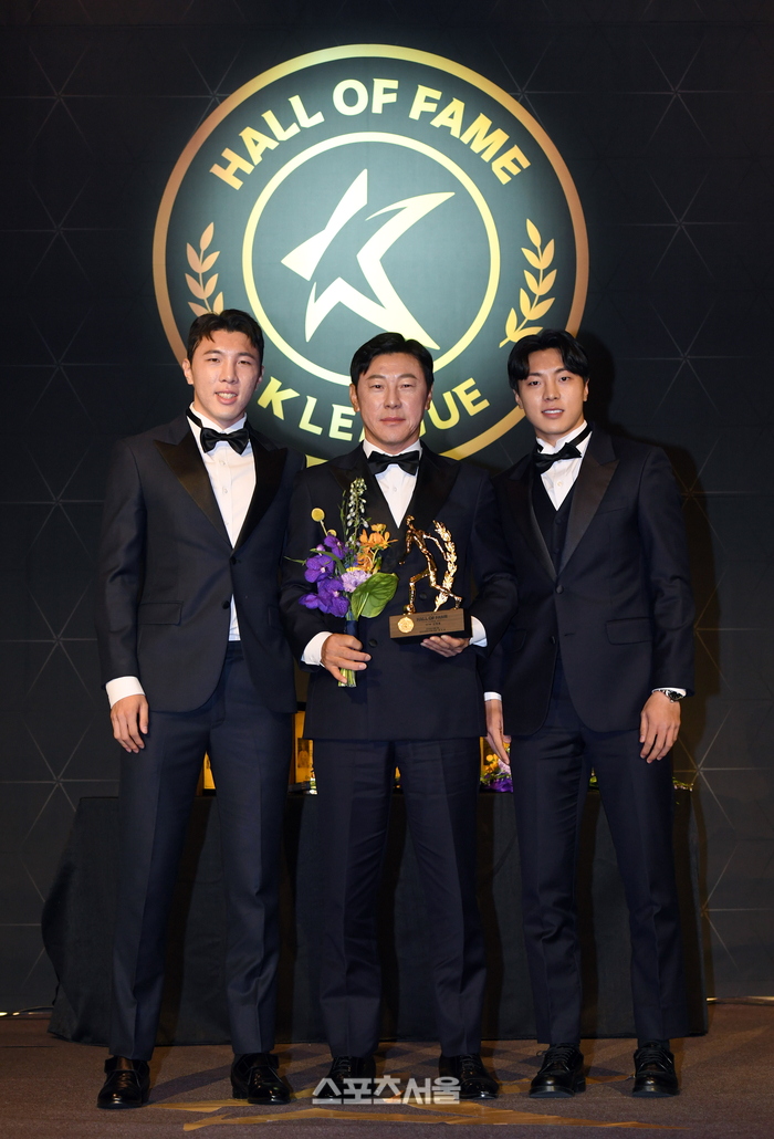 신태용 인도네시아 축구대표팀 감독(가운데)이 2일 서울 중구 앰버서더서울풀만호텔에서 진행된 K리그 명예의전당 헌액식에서 선수 부문 3세대 헌액자로 선정된 뒤 추천사를 한 아들 신재원(왼쪽)-신재혁과 기념촬영을 하고 있다. 2023. 5. 2.
