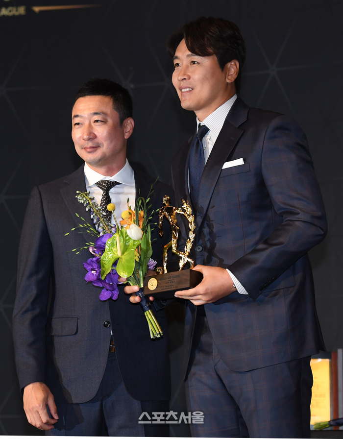 이동국 전 대한축구협회 부회장(오른쪽)이 2일 서울 중구 앰버서더서울풀만호텔에서 진행된 K리그 명예의전당 헌액식에서 선수 부문 4세대 헌액자로 선정된 뒤 추천사를 한 최태욱 한국프로축구연맹 기술위원과 기념촬영을 하고 있다. 2023. 5. 2.