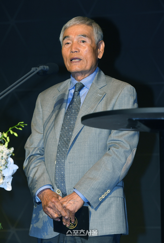 이회택 OB축구회 회장이 2일 서울 중구 앰버서더서울풀만호텔에서 진행된 K리그 명예의전당 헌액식에서 선수 부문 1세대 헌액자 최순호에 대한 추천사를 하고 있다. 2023. 5. 2.