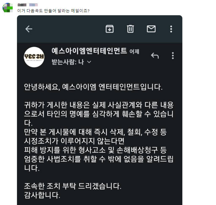 이후 유튜버는 유튜브 커뮤니티를 통해 “이거 다음 곡도 만들어 달라는 메일이죠?”라는 글과 함께 임창정 소속사 예스아이엠 엔터테인먼트로부터 받은 메일을 공개했다.