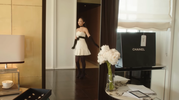 이어서 제니는 샤넬 흰색 미니드레스를 입고 등장했다. 검은 초커와 장갑을 착용하고 허리에는 흰색 동백꽃으로 포인트를 준 모습이었다. 제니는 “이게 제 첫 멧 갈라 의상이다”라고 말한 후 행사장으로 향했다.