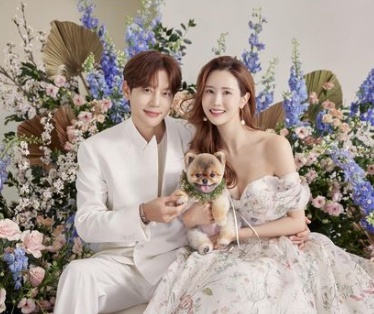 슈트를 입은 예비신랑 가수 세븐과의 투 샷도 담겼다. 반려견을 꼭 겨안고 웃는 두 사람은 선남선녀 비주얼로 감탄을 자아냈다.