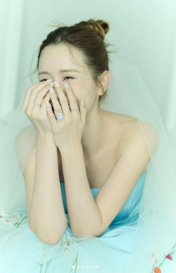사진 속 이다혜는 새 신부다운 청초하고 아름다운 비주얼로 눈길을 끌었다. 사진에는 하늘색 드레스를 입고 앉은 이다해가 미소를 지으며 입가를 가리고 있다. 큼지막한 반지를 착용한 이다혜는 청순한 미모를 뽐내고 있다.