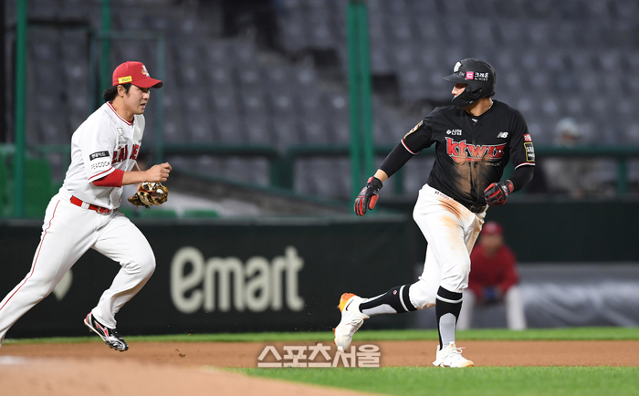 KT 위즈 황재균이 3일 인천 SSG랜더스필드에서 열린 2023 KBO리그 SSG 랜더스와 경기 6회초 1사 1-2루 상황에서 타자 이시원이 삼진 아웃 당한 사이 2루와 3루 사이에서 견제에 걸리면서 SSG 3루수 최정에게 쫓기고 있다. 2023. 5. 3.