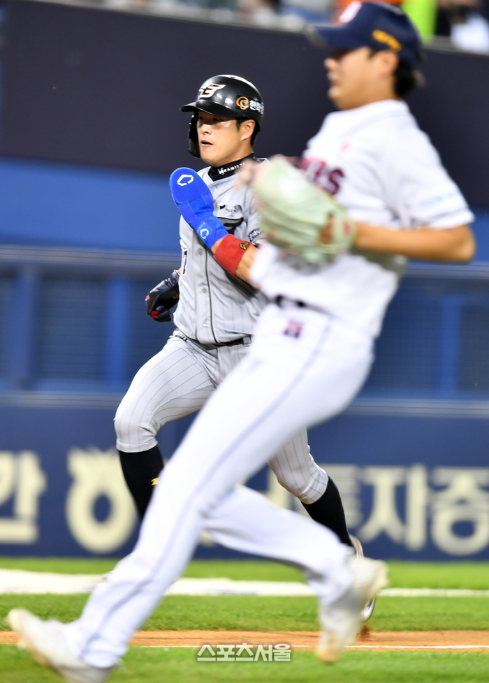 한화 9번타자 노수광이 3일 잠실구장에서 열린 2023프로야구 두산베어스와 한화이글스의 경기 7회초 1사 1,3루에서 정철원의 폭투가 나와 득점하고 있다. 2023.05.03.
