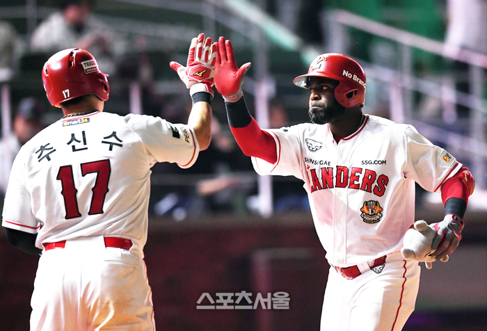 SSG 랜더스 에레디아가 3일 인천 SSG랜더스필드에서 열린 2023 KBO리그 KT 위즈와 경기 7회말 2사 1-3루 상황에서 KT 투수 손동현을 상대로 역전 3점 홈런을 친 뒤 추신수와 하이파이브를 하고 있다. 에레디아의 시즌 3호 홈런. 2023. 5. 3.