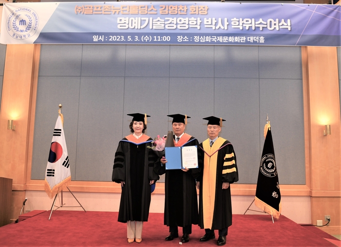 [스포츠서울 | 장강훈기자] 골프존뉴딘그룹 김영찬 회장이 충남대학교 기술실용화융합학과에서 명예기술경영학 박사 학위를 받았다.