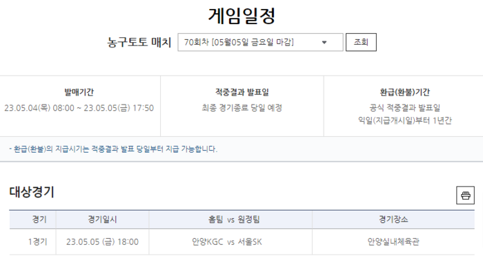 국민체육진흥공단이 발행하는 체육진흥투표권 스포츠토토의 수탁사업자 스포츠토토코리아는 4일 “오는 5일 오후 6시 안양실내체육관에서 열리는 2022-23 KBL 플레이오프 챔피언결정전 6차전인 안양KGC-서울SK전을 대상으로 하는 농구토토 70회차를 4일 오전 8시부터 발매한다”고 밝혔다.