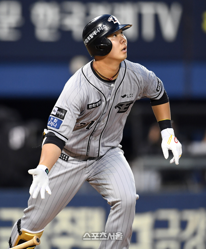 한화 이글스 김인환이 4일 잠실구장에서 열린 2023 KBO리그 두산 베어스와 경기 4회초 1사 1루 두산 선발 딜런을 상대로 2점 홈런을 치고 있다. 김인환의 시즌 2호 홈런. 2023. 5. 4.