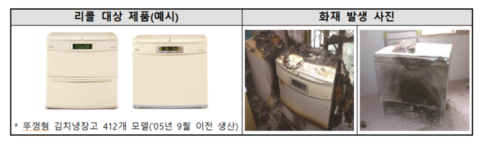 대상 제품은 위니아가 2005년 9월 이전 생산한 뚜껑형 딤채 김치냉장고 412개 모델이며, 장시간 사용했을 때 전기 신호로 제어하는 스위치인 릴레이 부품 주변에서 트래킹 현상 등으로 화재 우려가 있다.