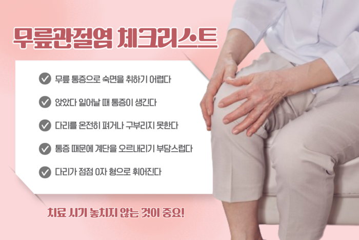 퇴행성 관절염은 극심한 통증과 관절의 변형, 보행 장애와 기력 저하로 활동량이 줄어 노년기 건강과 삶의 질을 크게 떨어뜨린다. 이에 부모님 무릎 건강 상태 확인을 위해 증상을 잘 체크해 보는 것이 중요하다.