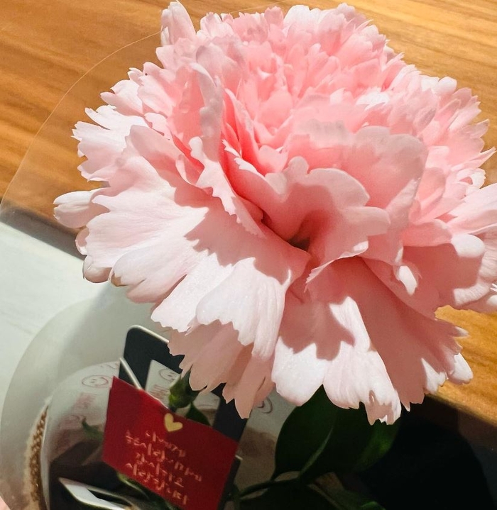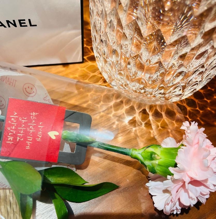 사진에는 풍성한 카네이션이 영롱한 자태를 뽐내고 있다. 카네이션 아래에는 “나에게 좋은 사람이기에 감사하고 사랑합니다”라는 글귀가 적혀 있다. 그 옆에는 화장품 병이 함께 놓여져 있다.