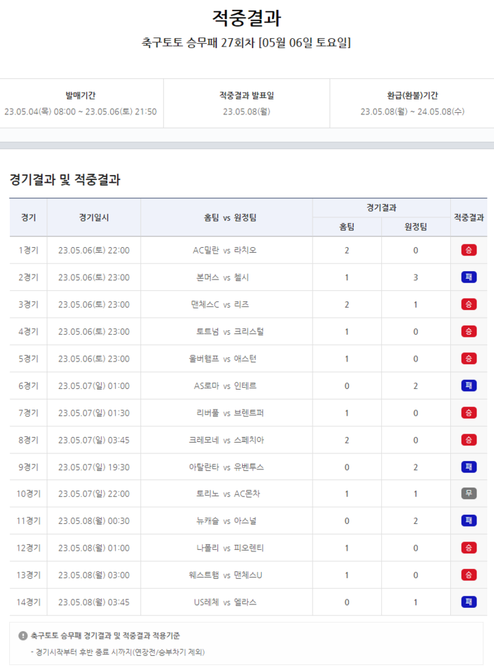 지난 6일 마감된 축구토토 승무패 27회차에서 14경기 결과를 모두 맞혀야 하는 1등은 단, 한 건이었다. 이를 제외한 적중 건수를 자세히 살펴보면, 2등(13경기 적중/143건), 3등(12경기 적중/1,934건), 4등(11경기 적중/12,929건)까지 이번 회차에서 총 1만5007건의 적중이 발생했다.