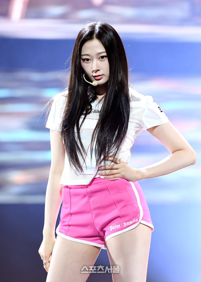 에스파 지젤이 8일 서울 강남구 코엑스 오디토리움에서 진행된 세 번째 미니앨범 ‘마이 월드(MY WORLD)’ 발매 기념 기자간담회에서 타이틀곡 ‘스파이시(Spicy)’ 무대를 선보이고 있다. 2023. 5. 8.