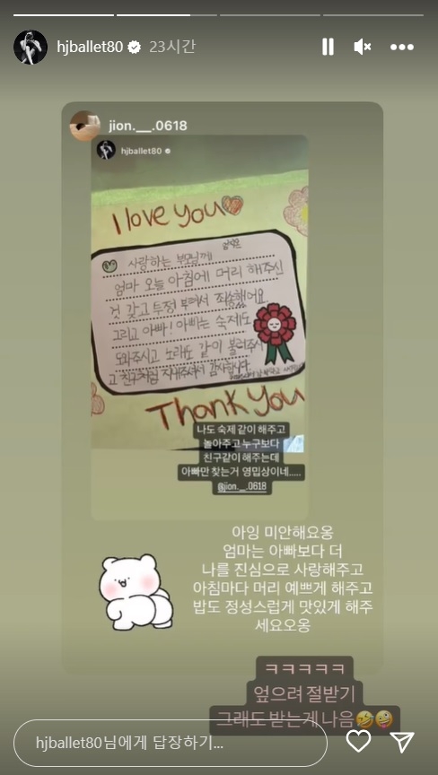 [스포츠서울 | 김지윤기자] 발레리나 윤혜진이 딸 지온의 어버이날 편지에 속상함을 드러냈다.