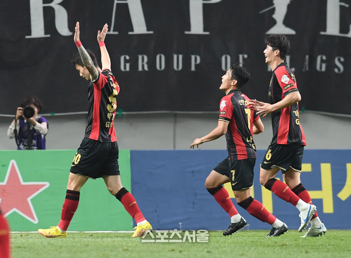 FC서울 박동진(왼쪽)이 9일 서울월드컵경기장에서 열린 2023 하나원큐 K리그1 광주FC와 경기에서 팀의 세 번째 골을 넣고 세리머니를 자제하는 제스처를 하고 있다. 2023. 5. 8.