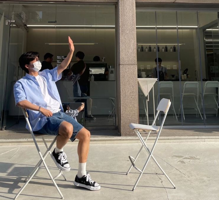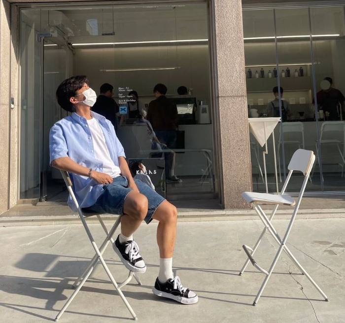 임영웅은 보기만 해도 시원한 여름용 청 반바지, 하늘색 반팔 셔츠와 흰 티를 입고 있다. 여기에 캐주얼한 스니커즈를 매치해 소년미가 돋보인다.