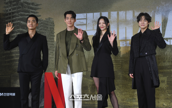 송승헌, 김우빈, 이솜, 강유석(왼쪽부터)이 10일 서울 영등포구 프로보크 서울에서 열린 넷플릭스 오리지널 ‘택배기사’ 제작발표회에서 포토타임을 갖고 있다. ‘택배기사’는 극심한 대기 오염으로 산소호흡기 없이는 살 수 없는 미래의 한반도, 전설의 택배기사 ‘5-8’과 난민 ‘사월’이 새로운 세상을 지배하는 천명그룹에 맞서며 벌어지는 일을 그린 시리즈로 오는 12일 공개 예정이다. 2023. 5. 10. 최승섭기자 thunder@sportsseoul.com