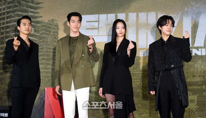 송승헌, 김우빈, 이솜, 강유석(왼쪽부터)이 10일 서울 영등포구 프로보크 서울에서 열린 넷플릭스 오리지널 ‘택배기사’ 제작발표회에서 포토타임을 갖고 있다. ‘택배기사’는 극심한 대기 오염으로 산소호흡기 없이는 살 수 없는 미래의 한반도, 전설의 택배기사 ‘5-8’과 난민 ‘사월’이 새로운 세상을 지배하는 천명그룹에 맞서며 벌어지는 일을 그린 시리즈로 오는 12일 공개 예정이다. 2023. 5. 10. 최승섭기자 thunder@sportsseoul.com